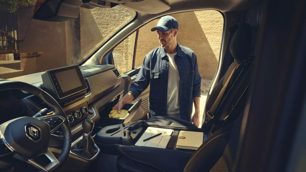 El Nuevo Renault Trafic te ofrece aún más soluciones útiles con sus 14 compartimentos bien integrados y distribuidos en la cabina, diseñados para guardar los objetos de uso cotidiano de los profesionales. Un voluminoso compartimento de 54 l situado bajo la banqueta del pasajero permite, en particular, guardar equipamientos y herramientas fuera del alcance de las miradas.